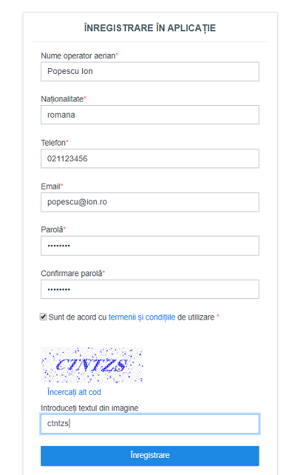 Completați câmpurile din formular cu numele de operator aerian (persoană fizică sau juridică),